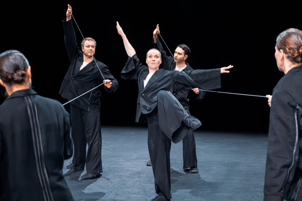 Itse jäin pohtimaan tätä kysymystä teoksen alussa. Joukkokohtauksissa täysin mustiin esiintymisasuihin pukeutuneiden tanssijoiden etäisyydet toisistaan olivat suuria. Tätä tanssijoiden välistä etäisyyttä korostivat nyörit, joita tanssijat aika ajoin vetivät välilleen. Silmämäärisesti näillä naruilla oli mittaa vähintään se suomalaisten ikioma turvaväli eli viisi metriä.
