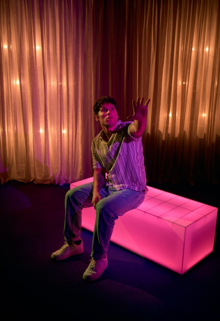 Parkkisen kädenjälki näkyi asemoinnissa. Istuin Teatteri Telakan katsomon eturivissä ja Orjuela näytteli pitkiä kohtauksia aivan kosketusetäisyydellä eturivillä istuneista. Ima Iduozeen laatima koreografia tanssitti Orjuelan välillä myös katsomon puolelle. Alle puoli metriä oli paljon vähemmän kuin se viiden metrin turvaväli, mukavuusalue, johon me suomalaiset olemme jopa teatterissa tottuneet. Näyttelijän fyysinen läsnäolo ja kohtaus kohtaukselta intensiteettiään kasvattanut tarina sulkivat meidät otteeseensa.