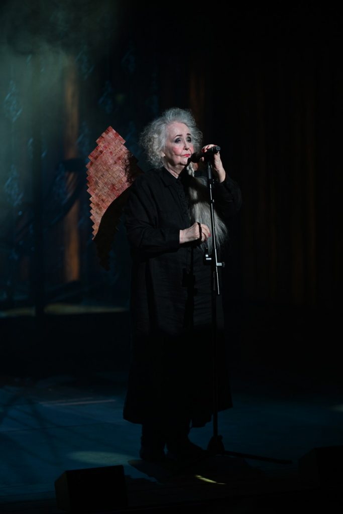Leena Uotila näytteli kahdessa bravuurissaan ensin voimakasta totuudenjälkeisen ajan poliitikon prototyyppiä ja sitten haurasta vanhusta, joka osasi yhä kertoa antiikin runollisen tarinan Arakhnen myytistä. Kuva © Darina Rodionova