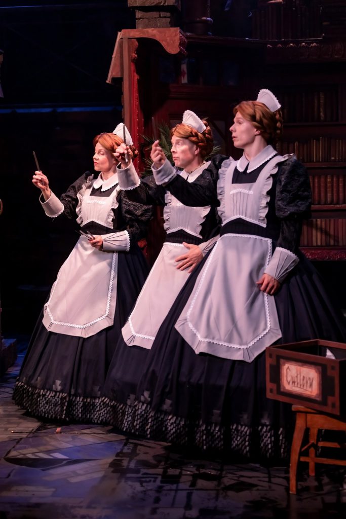 Silkkaa teatterin taikuutta oli esimerkiksi kohtaus, herra Brownlow’n kodinhoitajaa Bedwiniä ei näytellyt vain Lasse Viitamäki, vaan kohtauksessa olivat mukana myös Arttu Ratinen ja Elisa Piispanen kaikki kolme täsmälleen samanlaisiin peruukkeihin ja rooliasuihin pukeutuneina. Kuva © Heikki Järvinen