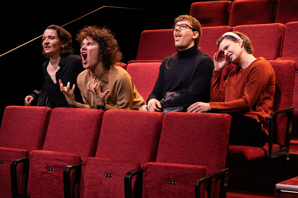 Jaakko Pietiläisen lavastuksessa tarinan wannabe-kulttuuirkriitikkoja varten oli Takomon näyttämölle pystytetty oma katsomo. Kuva (c) Jaakko Pietiläinen